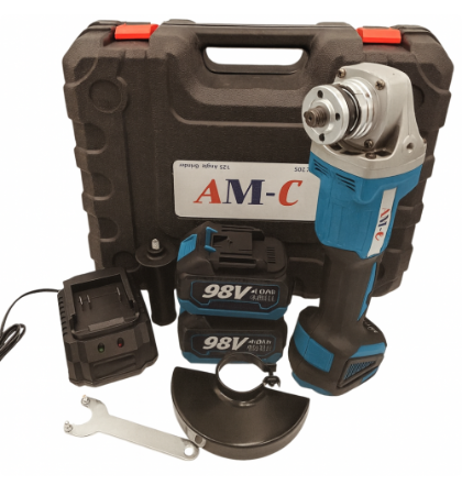 Descripción: Kit Completo: Incluye la amoladora angular, dos baterías de litio de 98V, un cargador, un mango auxiliar, una llave de apriete y un maletín de transporte.